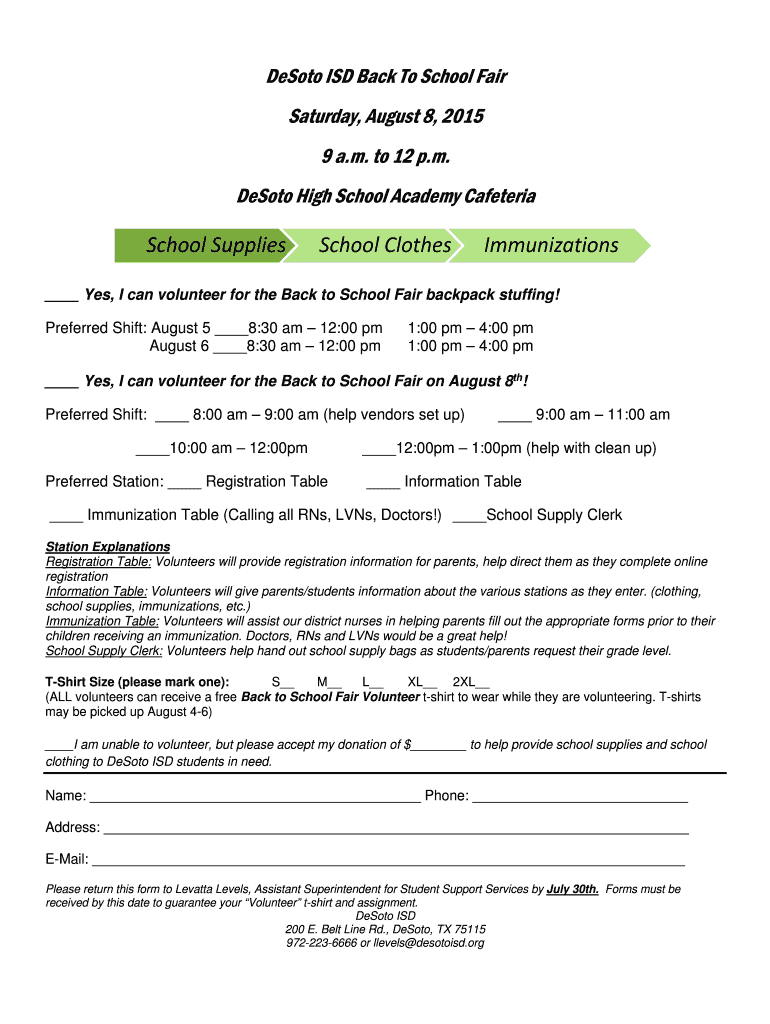 DeSoto ISD Back To School Fair Saturday, August 8, 2015 9 a.m. to 12 p.m. DeSoto High School Academy Cafeteria School Supplies School Clothes Immunizations Yes, I can volunteer for the Back to School