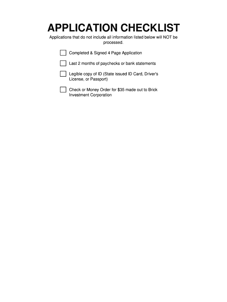 APPLICATION CHECKLIST Applications that do not include all information listed below will NOT be processed. Completed & Signed 4-Page Application Last 2 months of paychecks or bank statements Legible