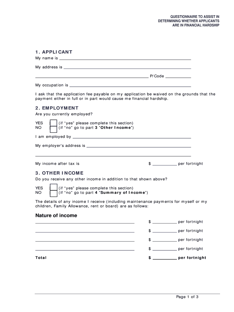QUESTIONNAIRE TO ASSIST IN DETERMINING WHETHER APPLICANTS ARE IN FINANCIAL HARDSHIP. 1. APPLICANT. My name is. My address is. P/Code. My occupation is.