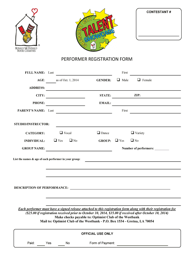 CONTESTANT # PERFORMER REGISTRATION FORM FULL NAME: Last AGE: First as of Oct. 1, 2014 GENDER: Male Female ADDRESS: CITY: PHONE: ZIP: STATE: EMAIL: PARENTS NAME: Last First STUDIO/INSTRUCTOR: Vocal