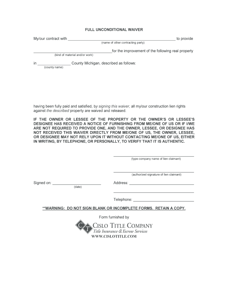 Get the free FULL UNCONDITIONAL WAIVER - Cislo Title