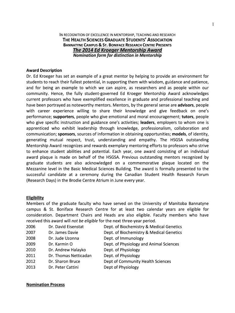 1 IN RECOGNITION OF EXCELLENCE IN MENTORSHIP, TEACHING AND RESEARCH THE HEALTH SCIENCES GRADUATE STUDENTS ASSOCIATION BALLANTYNE CAMPUS & ST. BONIFACE RESEARCH Center PRESENTS The 2014 Ed Kroger Mentorship