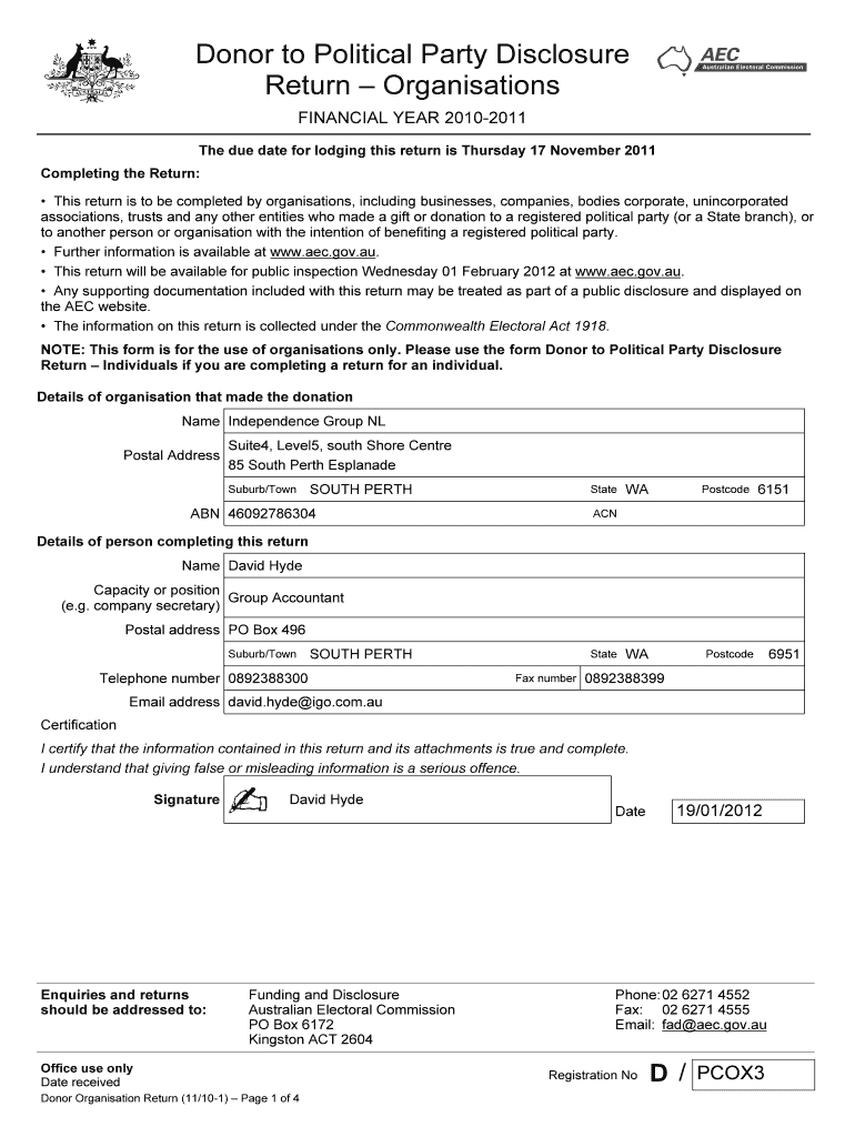 Donor to Political Party Disclosure Return Organizations FINANCIAL YEAR 20102011 The due date for lodging this return is Thursday 17 November 2011 Completing the Return: This return is to be completed