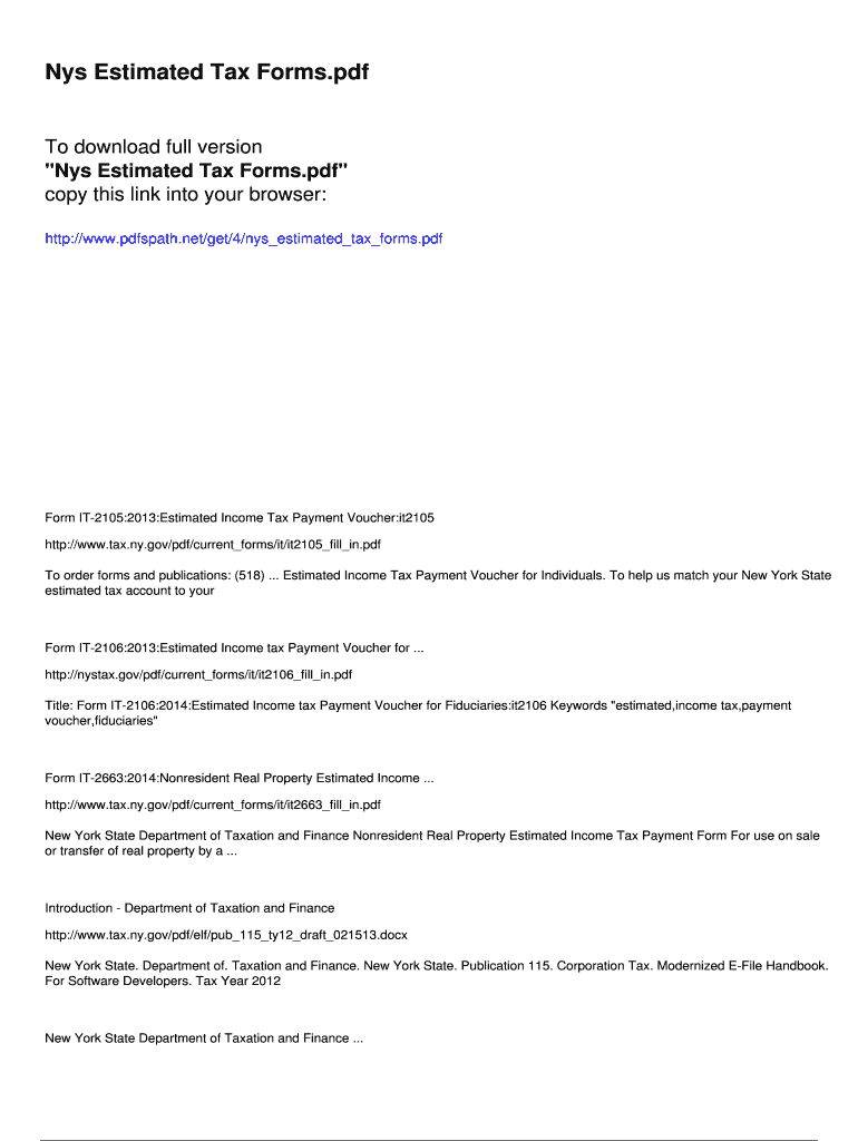 NYS Estimated Tax Forms.pdf To download full version “NYS Estimated Tax Forms.pdf copy this link into your browser: http://www.pdfspath.net/get/4/nys estimated tax forms.pdf Form IT2105:2013:Estimated