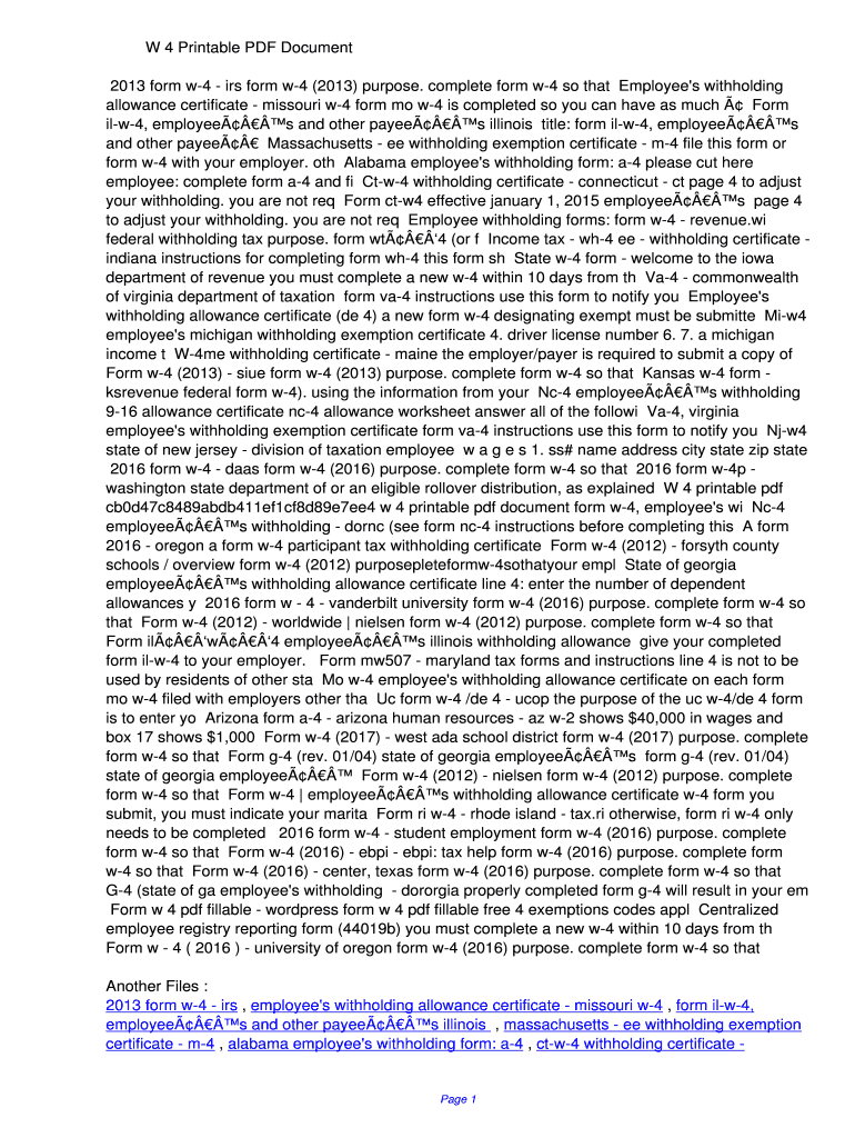 W 4 Printable PDF Document 2013 form w4 IRS form w4 (2013) purpose. Complete form w4 so that Employee's withholding allowance certificate Missouri w4 form mo w4 is completed, so you can have as much