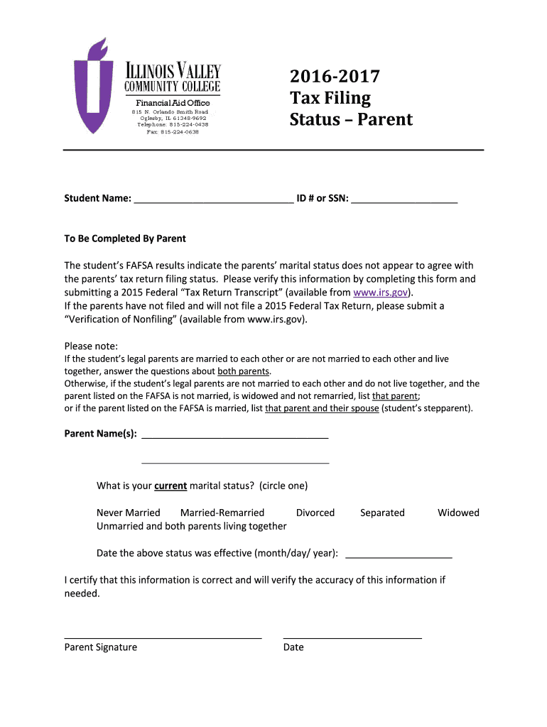 20162017 Tax Filing Status Parent Student Names: ID # or SSN: To Be Completed By Parent The students FAFSA results indicate the parents marital status does not appear to agree with the parents tax
