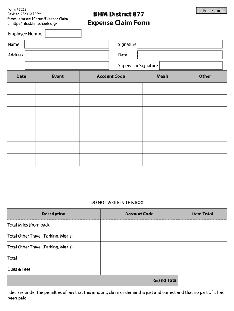Form #3032 Revised 9/2009 TB/CR forms location: I:Forms/Expense Claim or http://intra.bhmschools.org/ Print Form BHM District 877 Expense Claim Form Employee Number Name Signature Address Date Supervisor