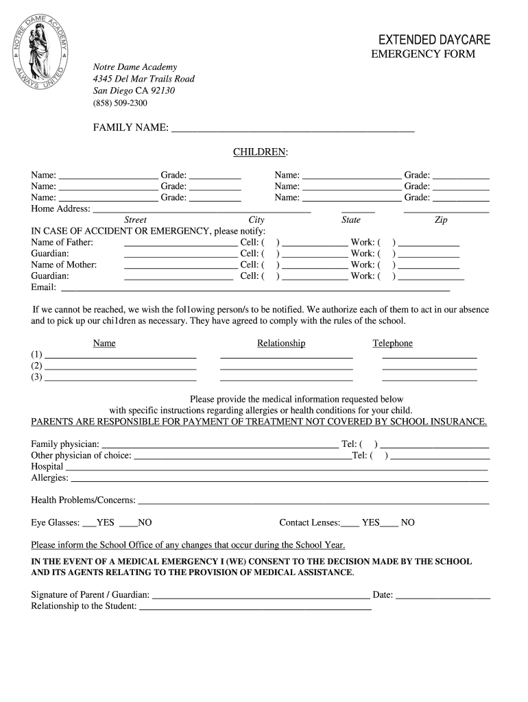 EXTENDED DAYCARE EMERGENCY FORM 4345 Del Notre Dame Academy 4345 Del Mar Trails Road San Diego CA 92130 (858) 5092300 FAMILY NAME: CHILDREN: Name: Grade: Name: Grade: Name: Grade: Name: Grade: Name: