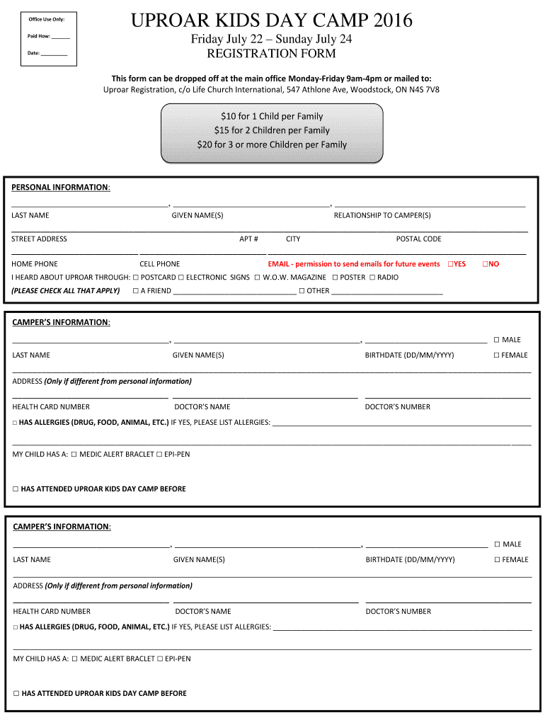 UPROAR KIDS DAY CAMP 2016 Office Use Only: Friday, July 22 Sunday, July 24 REGISTRATION FORM Paid How: Date: This form can be dropped off at the main office Monday Friday 9am4pm or mailed to: Uproar