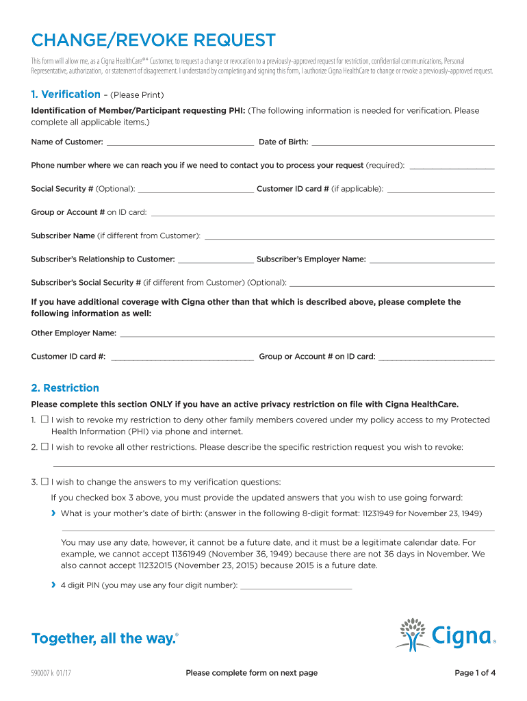 CHANGE/REVOKE REQUEST This form will allow me, as a Cagney Healthcare* Customer, to request a change or revocation to a previously approved request for restriction, confidential communications, Personal