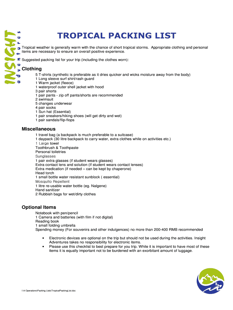 TROPICAL PACKING LIST Tropical weather is generally warm with the chance of short tropical storms. Appropriate clothing and personal items are necessary to ensure an overall positive experience. Suggested