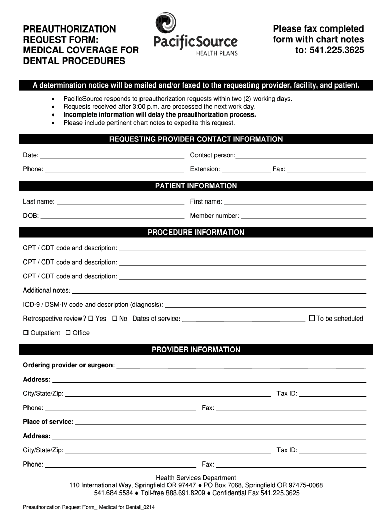 Any healthcare provider or patient in Oregon seeking approval for dental procedures can use the PacificSource Preauthorization Request Form. It’s crucial that the patient has valid insurance coverage with PacificSource.