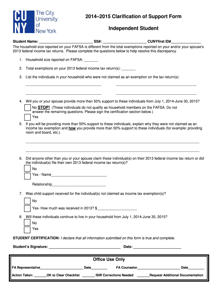 Get the free 2014 2015 Clarification of Support Form Independent ... - CUNY.edu - cuny
