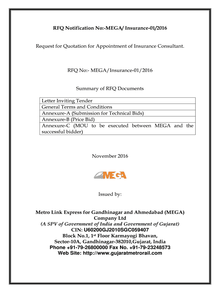 RFQ Notification No:MEGA/ Insurance01/2016 Request for Quotation for Appointment of Insurance Consultant. RFQ No: MEGA/Insurance01/2016 Summary of RFQ Documents Letter Inviting Tender General Terms