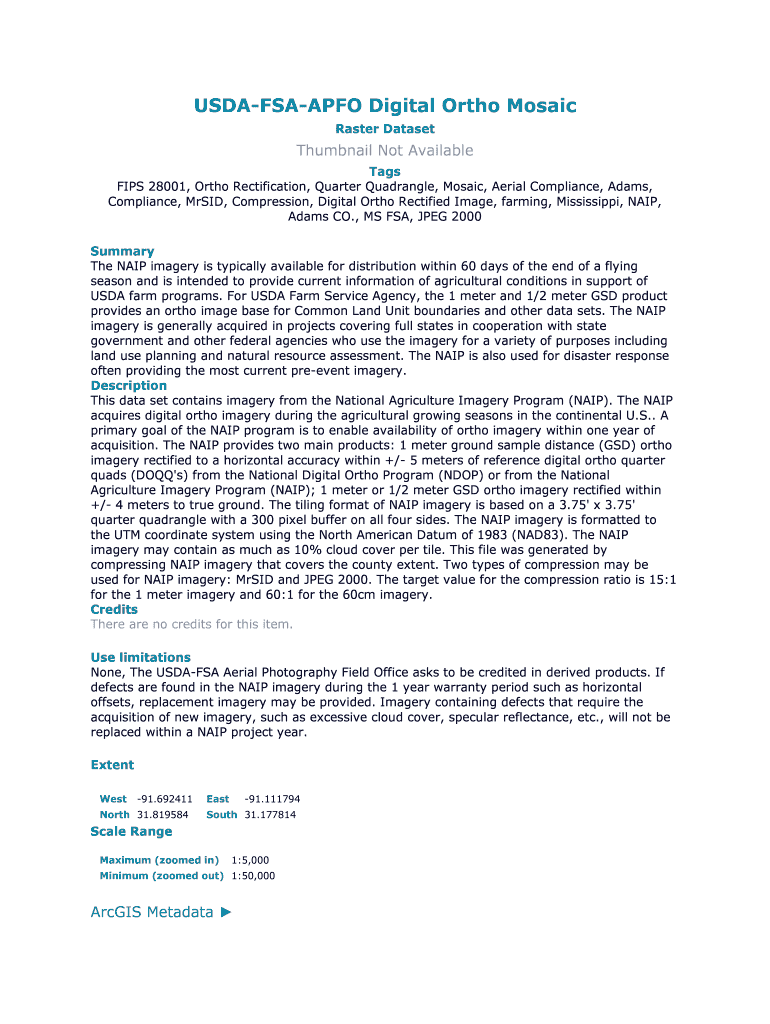 USDAFSAAPFO Digital Or tho Mosaic Raster Dataset Thumbnail Not Available Tags FIPS 28001, Or tho Rectification, Quarter Quadrangle, Mosaic, Aerial Compliance, Adams, Compliance, Mr SID, Compression,