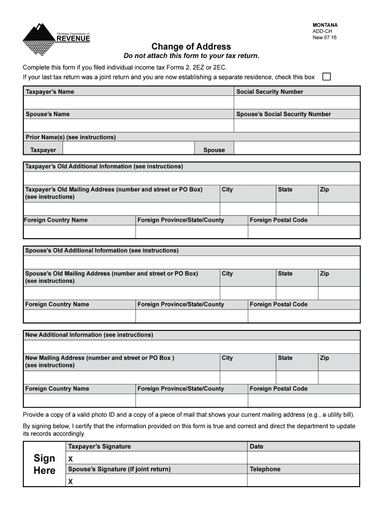 MONTANA ADD-CH New 07 16 Change of Address Do not attach this form to your tax return. Complete this form if you filed individual income tax Forms 2, 2EZ or 2EC.