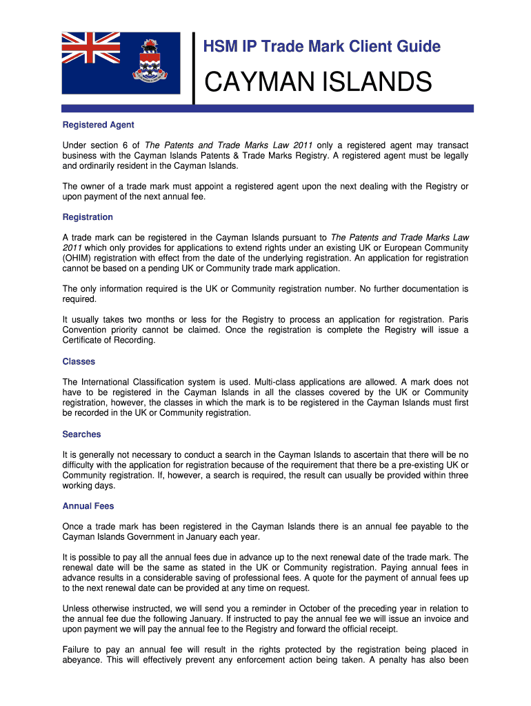 HSM IP trademark Client GuideCAYMAN ISLANDS Registered Agent Under section 6 of The Patents and trademarks Law 2011 only a registered agent may transact business with the Cayman Islands Patents &