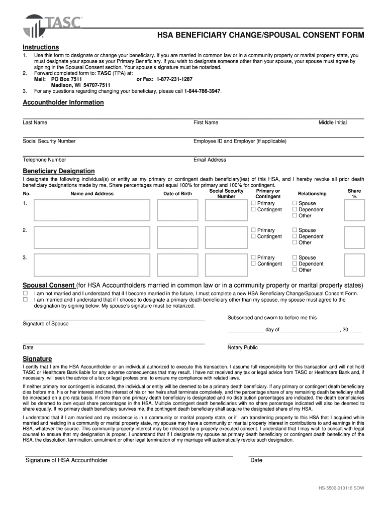 HSA BENEFICIARY CHANGE/SPOUSAL CONSENT FORM. ... Beneficiary Designation. ... TASK or Healthcare Bank liable for any adverse consequences that may result.