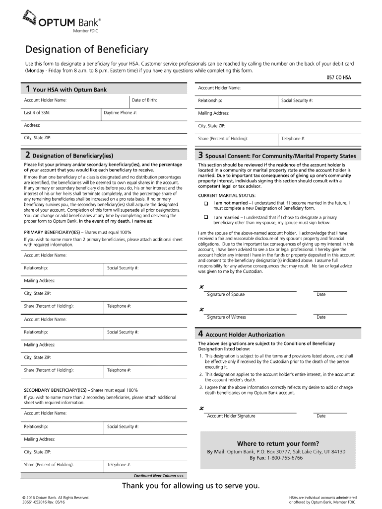 Use this form to designate a beneficiary for your HSA. ... 057 CO HSA. 1. Your HSA with Opium Bank. ... must complete a new Designation of Beneficiary form.