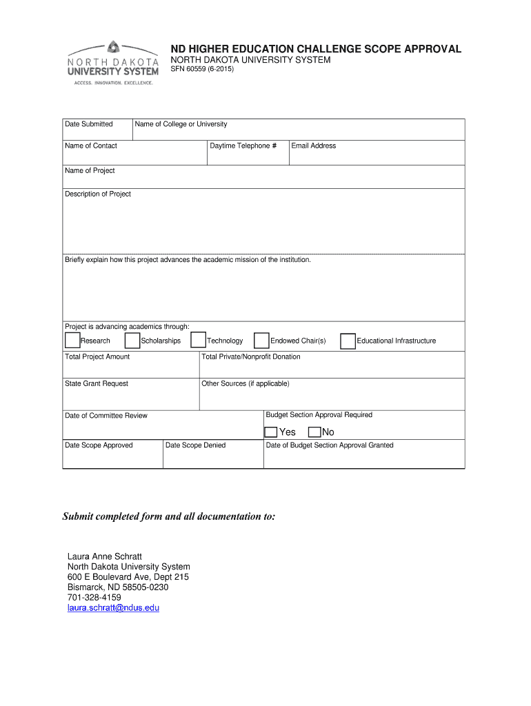 Page 1. ND HIGHER EDUCATION CHALLENGE SCOPE APPROVAL. NORTH DAKOTA UNIVERSITY SYSTEM. SON 60559 (6-2015). Date Submitted.