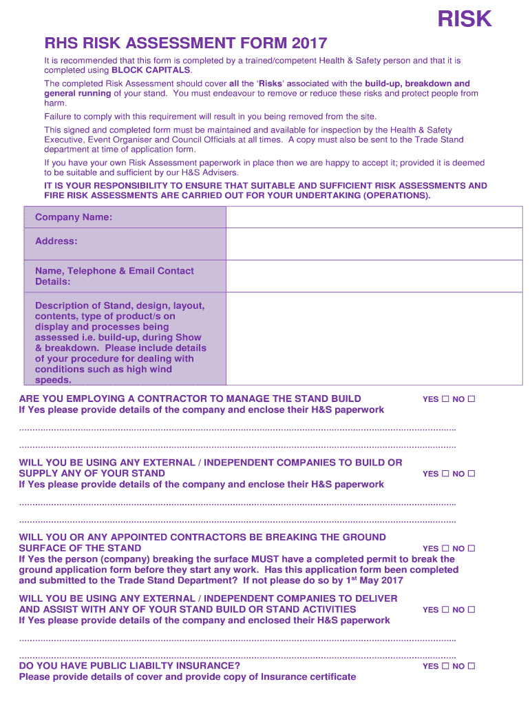 RHS RISK ASSESSMENT FORM 2017. ... IT IS YOUR RESPONSIBILITY TO ENSURE THAT SUITABLE AND SUFFICIENT RISK ASSESSMENTS AND ... Signature:
