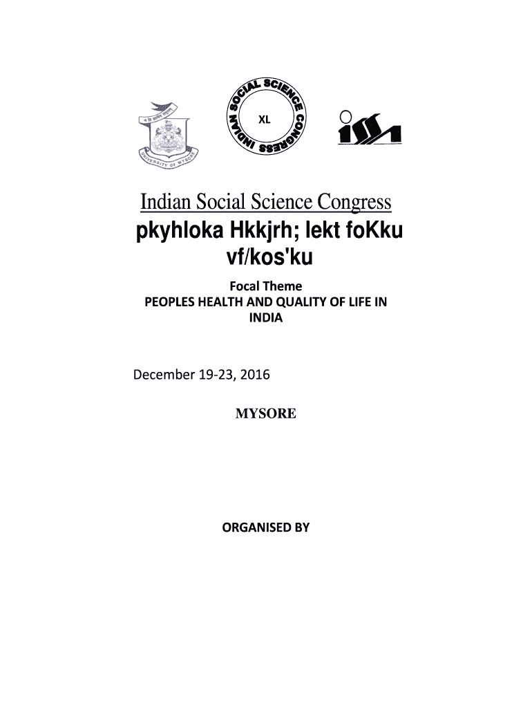 XL Indian Social Science Congress skyhook Hikers; left folk VF/KOS 'KU Focal Theme PEOPLES HEALTH AND QUALITY OF LIFE IN INDIA December 1923, 2016 MYSORE Organized BY Hikers; left folk done INDIAN