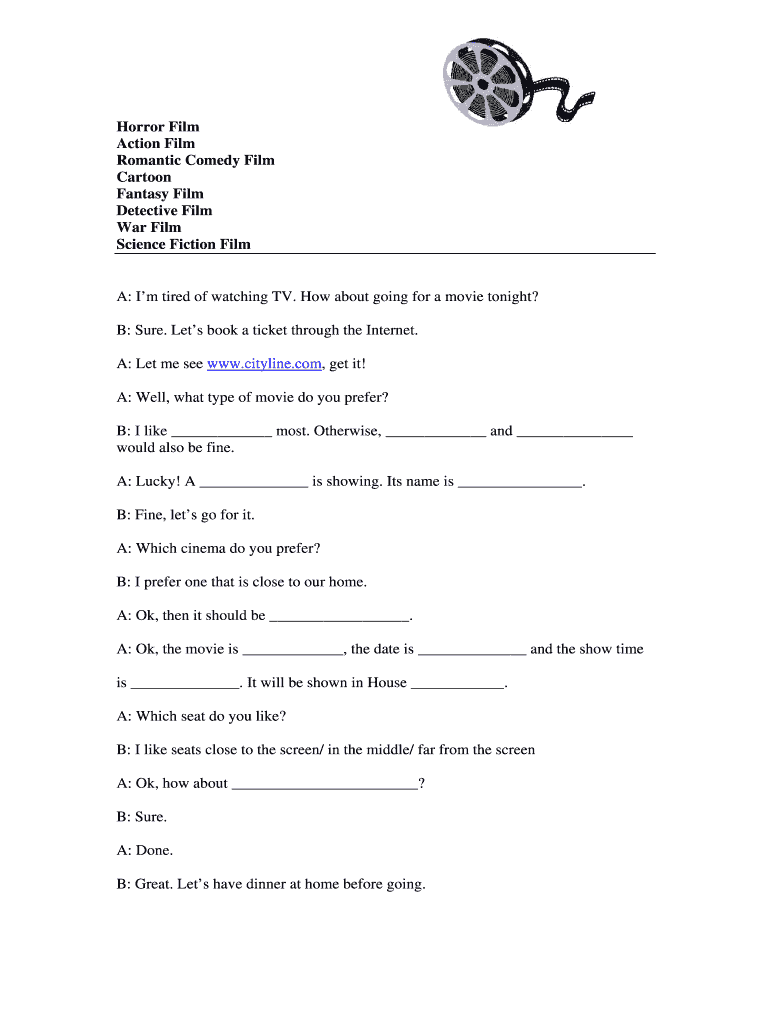 Horror Film Action Film Romantic Comedy Film Cartoon Fantasy Film Detective Film War Film Science Fiction Film A: I'm tired of watching TV. How about going for a movie tonight? B: Sure. Let's book