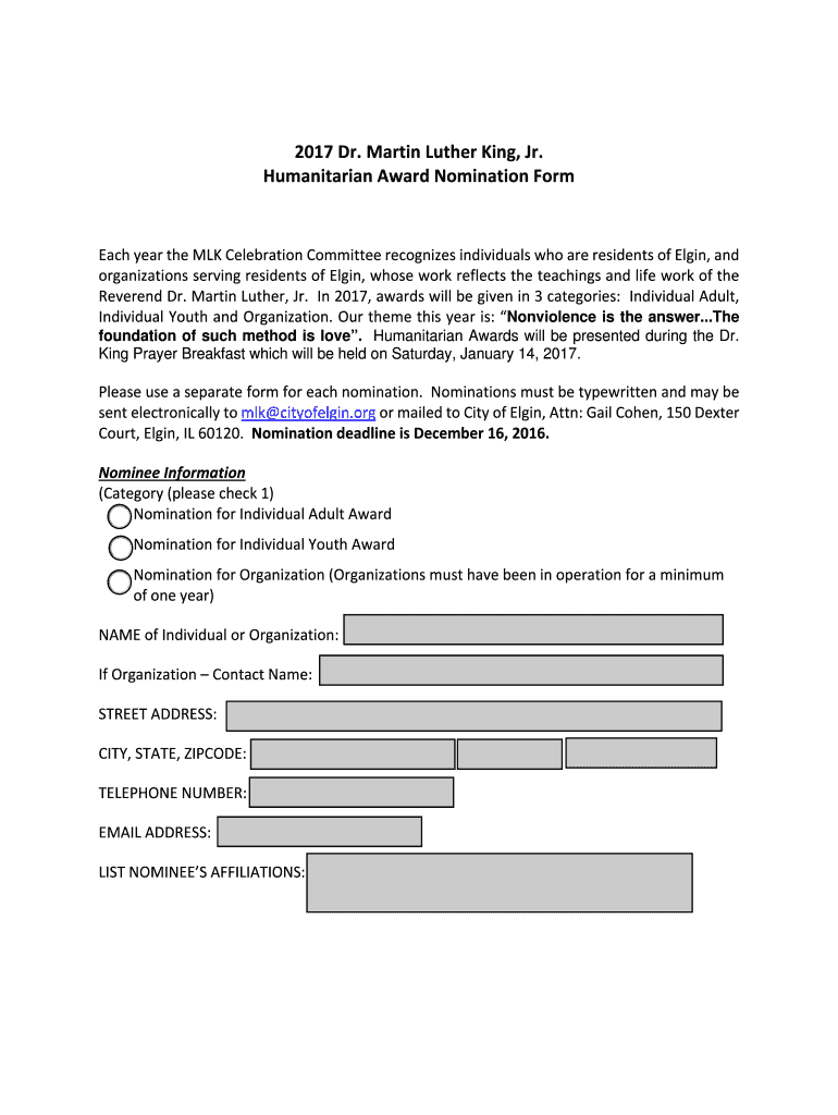 Get the free 2017 Dr. Martin Luther King, Jr. Humanitarian Award Nomination Form - cityofelgin