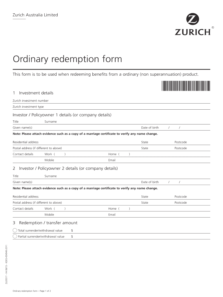 ... (non superannuation) ... Name of financial ... have enclosed the original policy documents issued by Zurich with this form or I/we declare that the ...