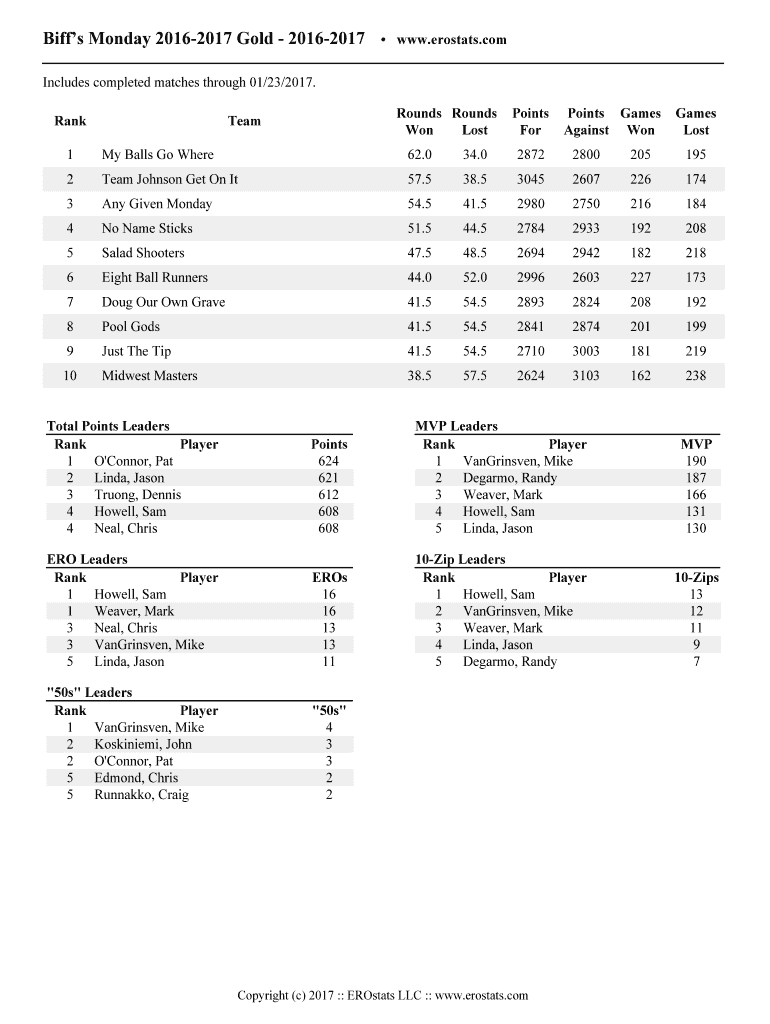 Biffs Monday 20162017 Gold 20162017 www.erostats.com Includes completed matches through 01/23/2017. Rank Rounds Won Lost Team Points For Points Games Against Won Games Lost 1 My Balls Go Where 62.0