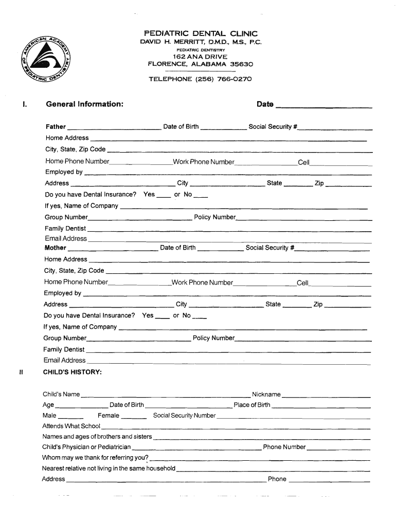 PEDIATRIC DENTAL CLINIC DAVID H. MERRITT, D.M.D., M.S., P.C. PEDIATRIC DENTISTRY 162 ANA DRIVE FLORENCE, ALABAMA 35630 TELEPHONE (256) 7660270 I. Date General Information: Father Social Security #