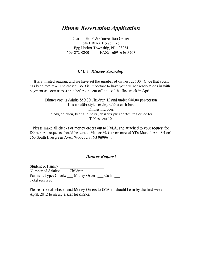 Dinner Reservation Application Clarion Hotel & Convention Center 6821 Black Horse Pike Egg Harbor Township, NJ 08234 6092720200 FAX: 609 6463703 I.M.A. Dinner Saturday It is a limited seating, and