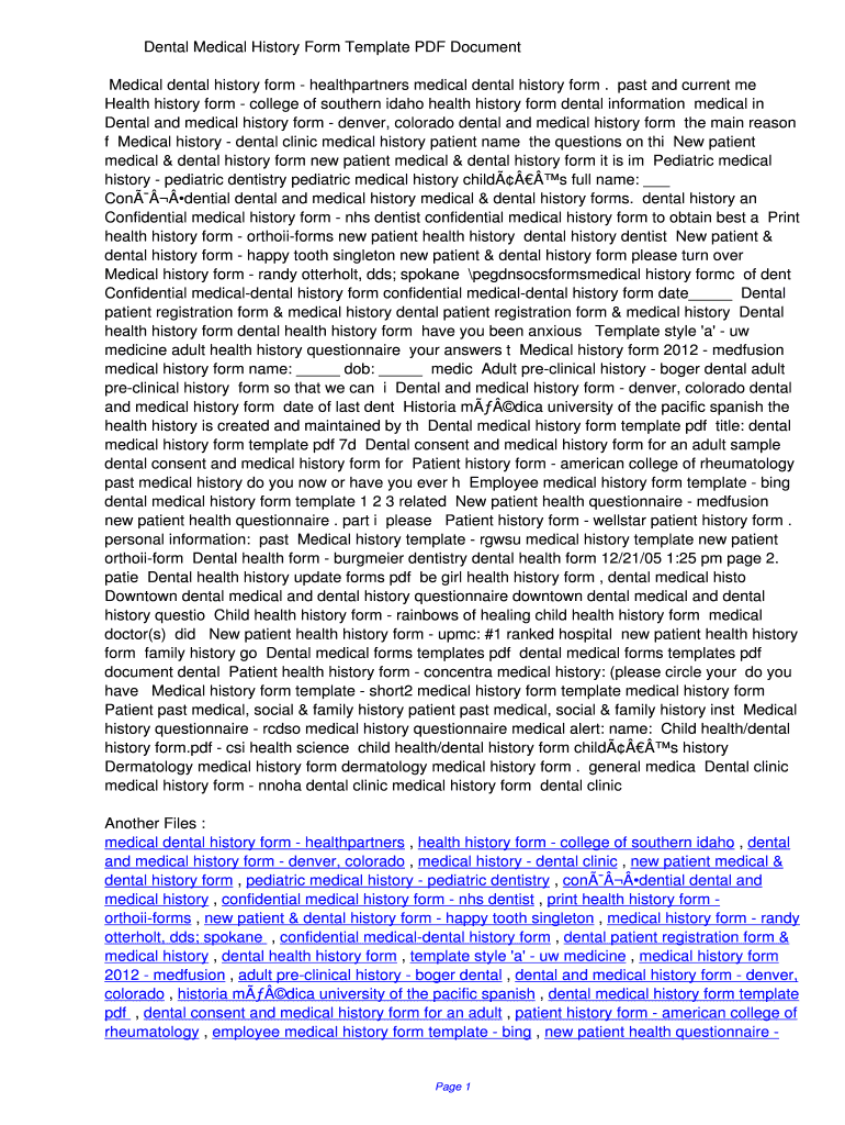 Dental Medical History Form Template PDF Document Medical dental history form health partners medical dental history form. Past and current me Health history form college of southern Idaho health