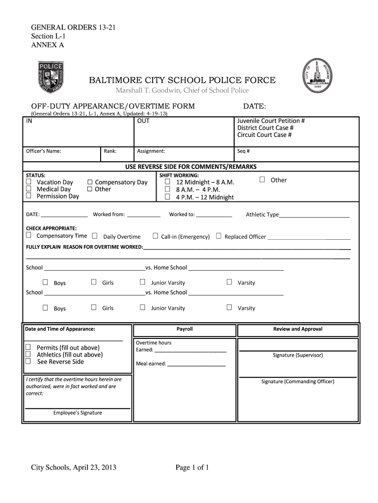 GENERAL ORDERS 1321 Section L1 ANNEX A BALTIMORE CITY SCHOOL POLICE FORCE Marshall T. Goodwin, Chief of School Police DUTY APPEARANCE/OVERTIME FORM DATE: (General Orders 1321, L1, Annex A, Updated: