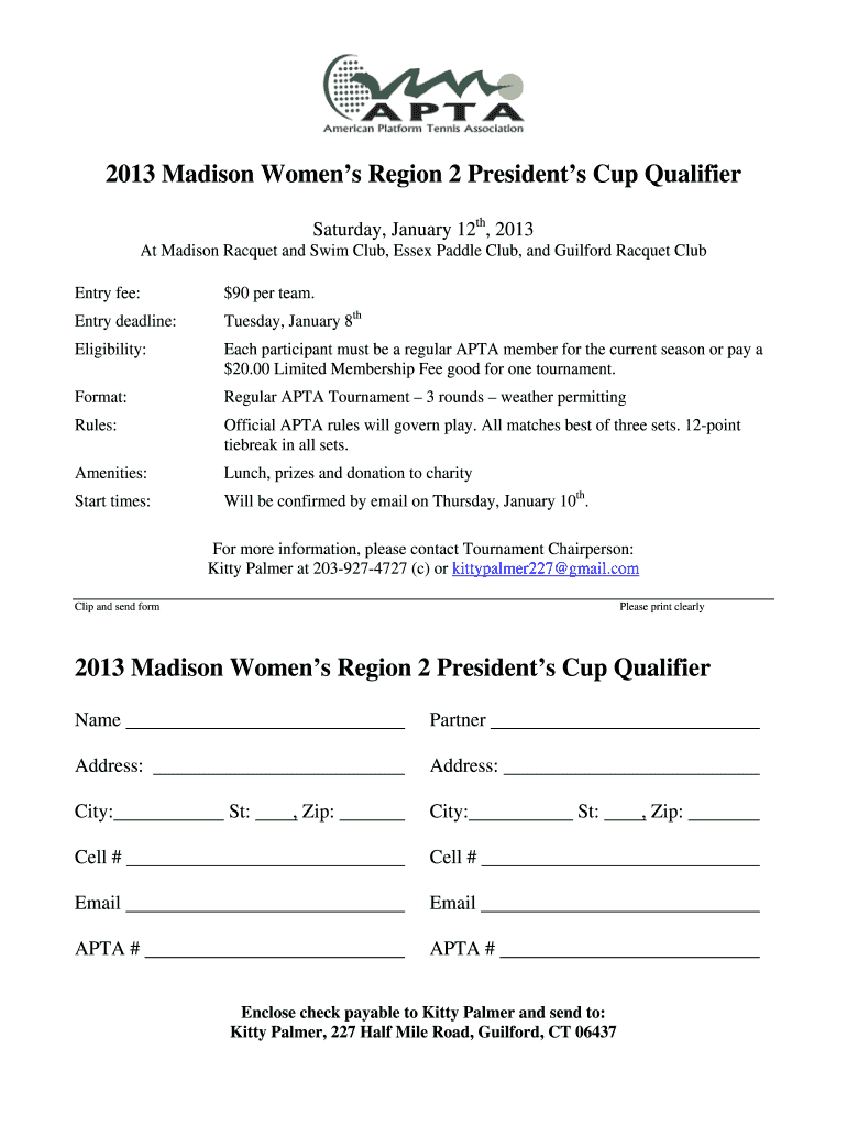 2013 Madison Women's Region 2 Presidents Cup Qualifier Saturday, January 12th, 2013 At Madison Racquet and Swim Club, Essex Paddle Club, and Guilford Racquet Club Entry fee: $90 per team. Entry deadline:
