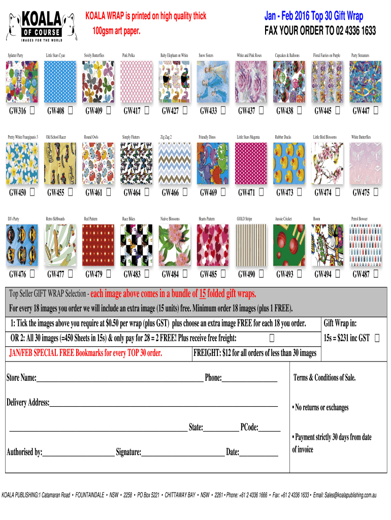 Jan Feb 2016 Top 30 Gift Wrap FAX YOUR ORDER TO 02 4336 1633 KOALA WRAP is printed on high quality thick 100gsm art paper. Splatter Party GW316 Pretty White Frangipanis 3 GW450 DJ's Party GW476 Little