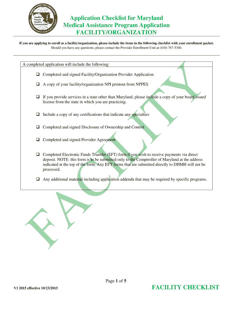 FACILITY Application Checklist for Maryland Medical Assistance Program Application FACILITY/ORGANIZATION Page 1 of 5 V1 2015 effective 10/23/2015 FACILITY CHECKLIST