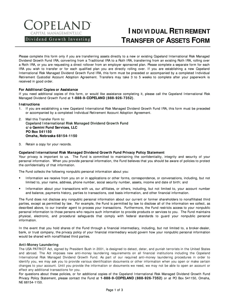INDIVIDUAL RETIREMENT TRANSFER OF ASSETS FORM Please complete this form only if you are transferring assets directly to a new or existing Copeland International Risk Managed Dividend Growth Fund IRA,