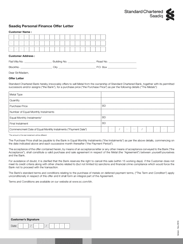 Get the free Saadiq Personal Finance Offer Letter - Standard Chartered Bank