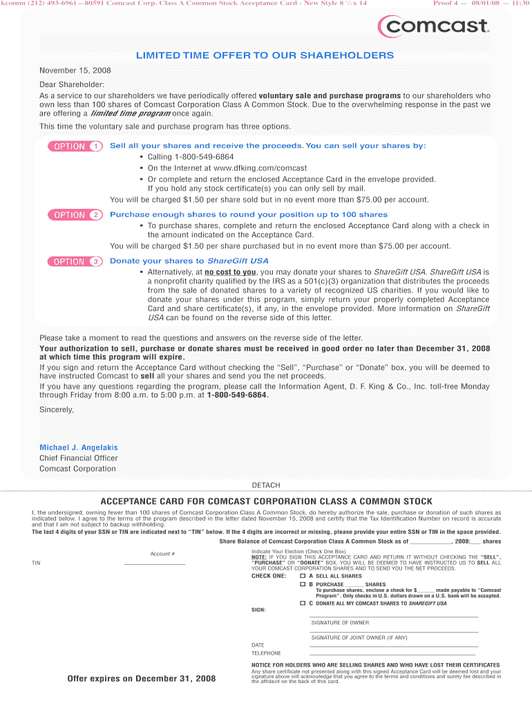 The Comcast Class A Common Stock Acceptance Card is a crucial form for shareholders of Comcast Corporation. This document serves a specific purpose: it allows shareholders who own fewer than 100 shares to authorize various transactions related to their stocks. It is important to note that this offer is only available for a limited period.