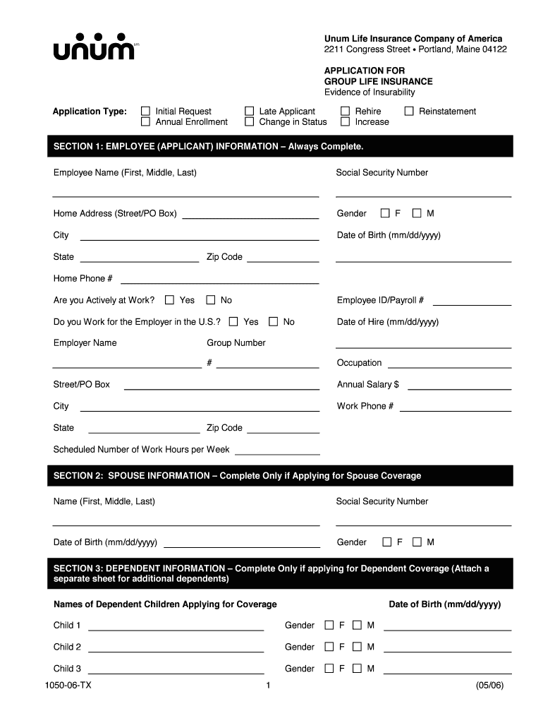 Get the free 1050-06-TX 1 (05/06) Unum Life Insurance Company of America ...