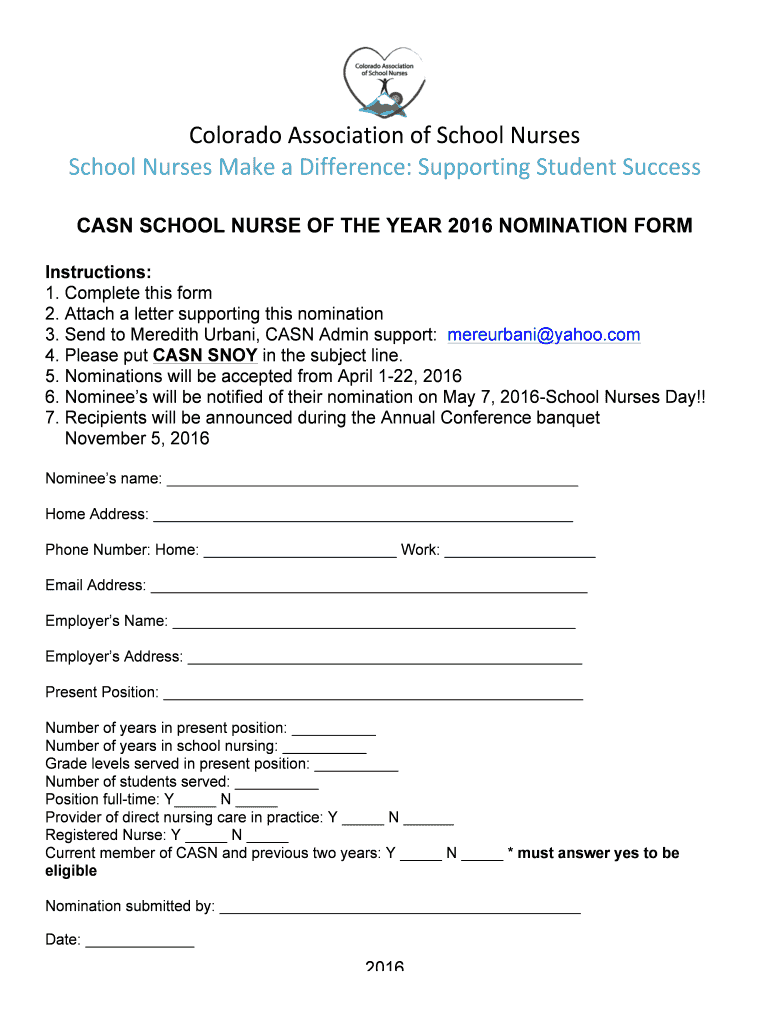 CAN SCHOOL NURSE OF THE YEAR 2016 NOMINATION FORM Instructions: 1. Complete this form 2. Attach a letter supporting this nomination 3.