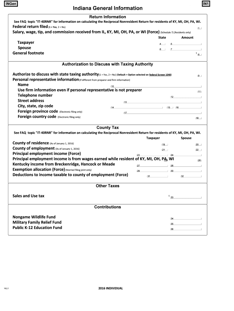 Inge IN1 Inge (2016) Indiana General Information Return Information See FAQ topic “IT40RNR for information on calculating the Reciprocal Nonresident Return for residents of KY, MI, OH, PA, WI. Federal