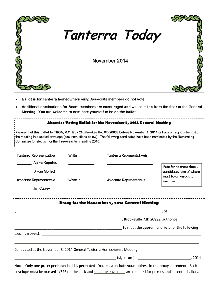 Canberra Today November 2014 Ballot is for Canberra homeowners only; Associate members do not vote. Additional nominations for Board members are encouraged and will be taken from the floor at the