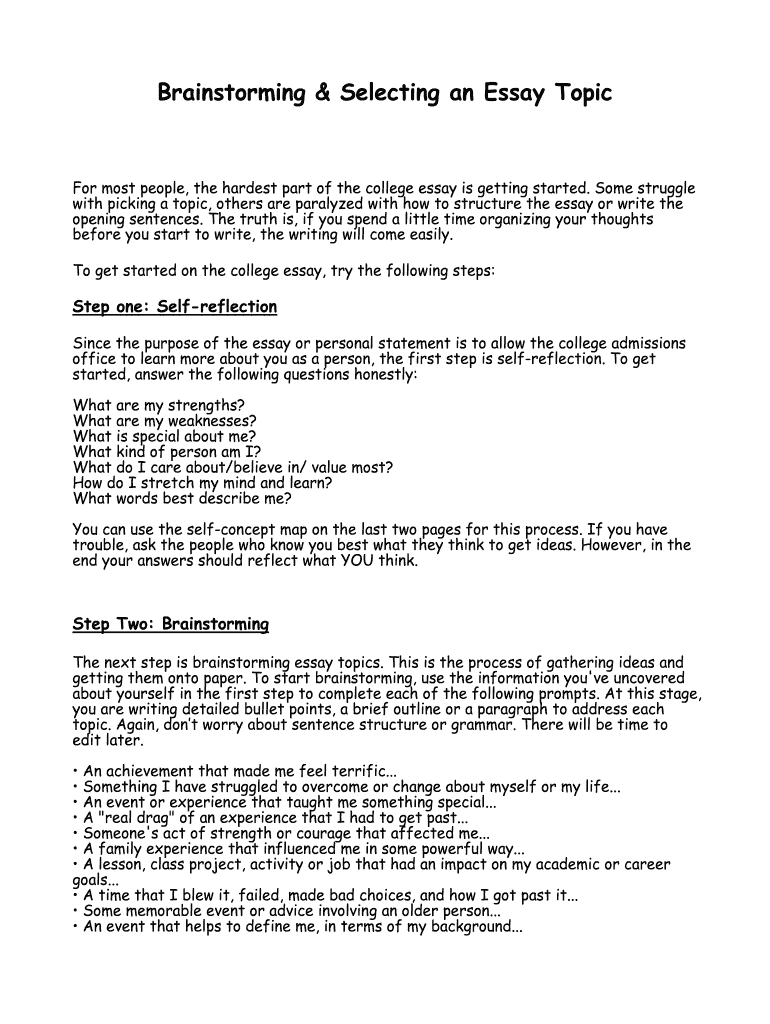 Brainstorming & Selecting an Essay Topics most people, the hardest part of the college essay is getting started. Some struggle with picking a topic, others are paralyzed with how to structure the