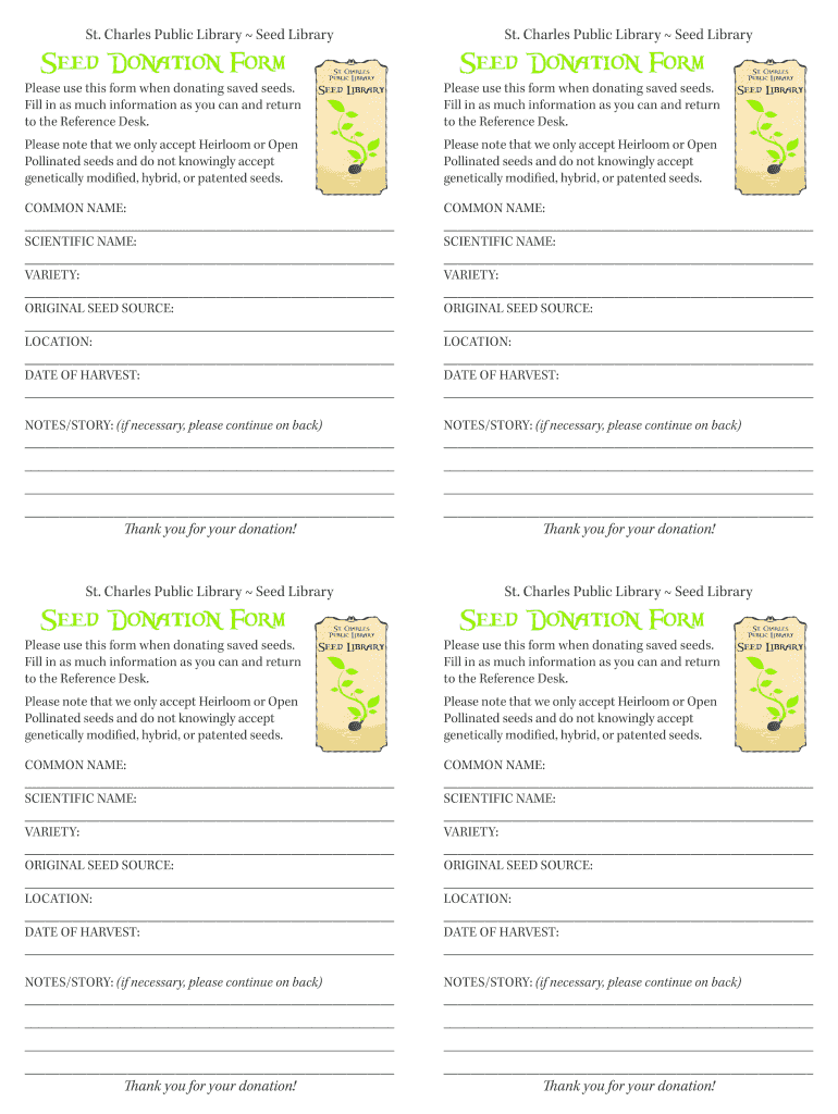 St. Charles Public Library Seed Donation Form Please use this form when donating saved seeds. Fill in as much information as you can and return to the Reference Desk. St. Charles Public Library Seed
