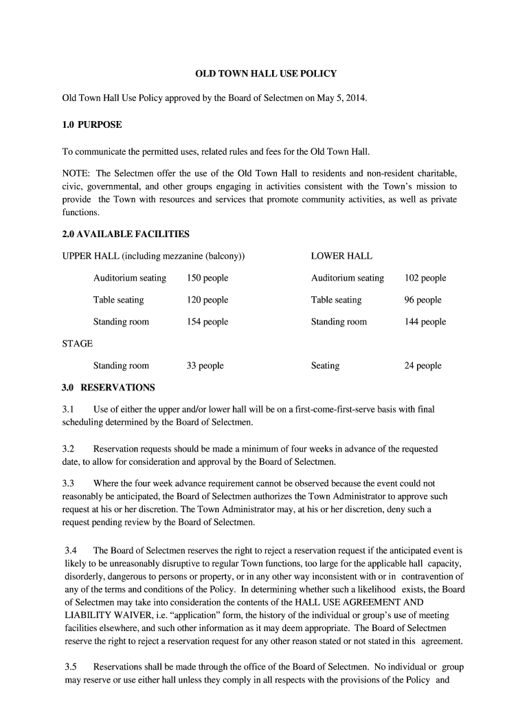 Old Town Hall Use Policy approved by the Board of Selectmen on May 5, 2014.
