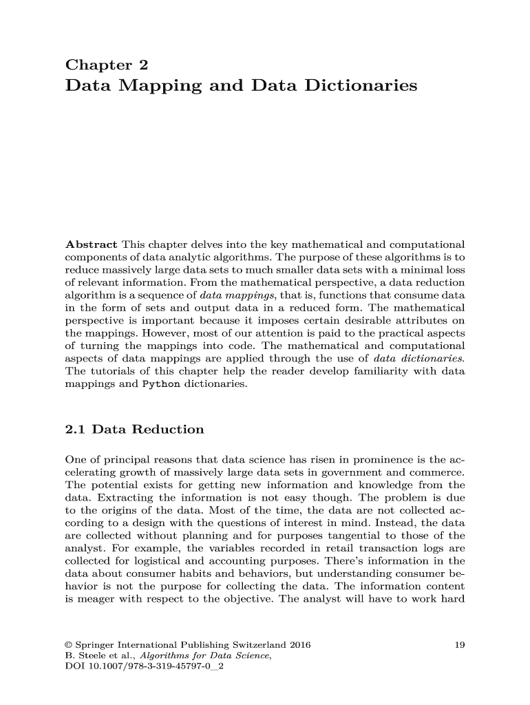 Chapter 2 Data Mapping and Data Dictionaries Abstract This chapter delves into the key mathematical and computational components of data analytic algorithms. The purpose of these algorithms is to