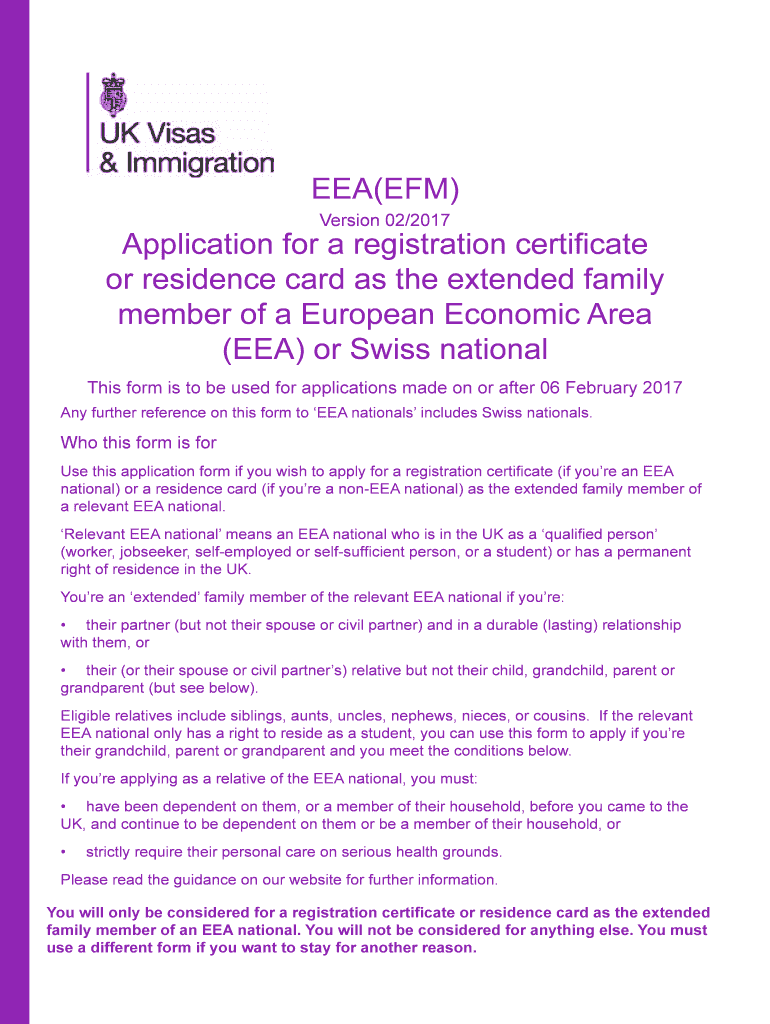 EEA(FM) Version 02/2017 Application for a registration certificate or residence card as the extended family member of a European Economic Area (EEA) or Swiss national This form is to be used for applications
