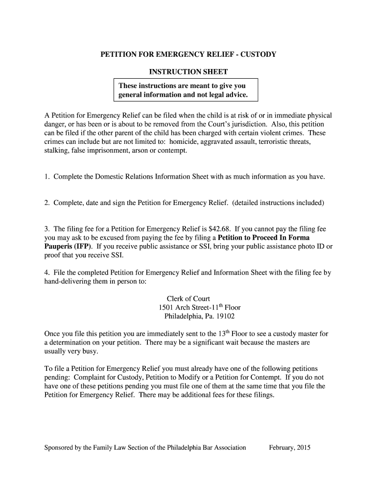Get the free PETITION FOR EMERGENCY RELIEF - CUSTODY - philadelphiabar